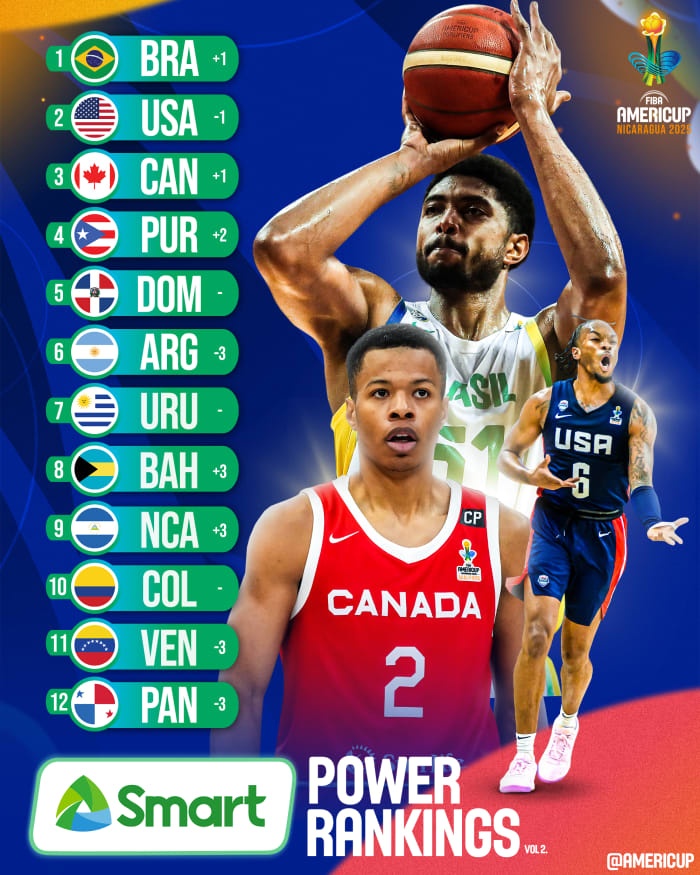 懂球直播8月20日讯 今天,男篮美洲杯官方公布了新一期的美洲杯实力榜,巴西男篮升至第一,美国男篮降至第二。具体如下(括号内为相比上一期的升降名次): 1、巴西男篮(+1) 2、美国男篮(-1) 3、加拿大男篮(+1) 4、波多黎各男篮(+2) 5、多米尼加男篮 6、阿根廷男篮(-3) 7、乌拉圭男篮 8、巴哈马男篮(+3) 9、尼加拉瓜男篮(+3) 10、哥伦比亚男篮 11、委内瑞拉男篮(-3) 12、巴拿马男篮(-3)