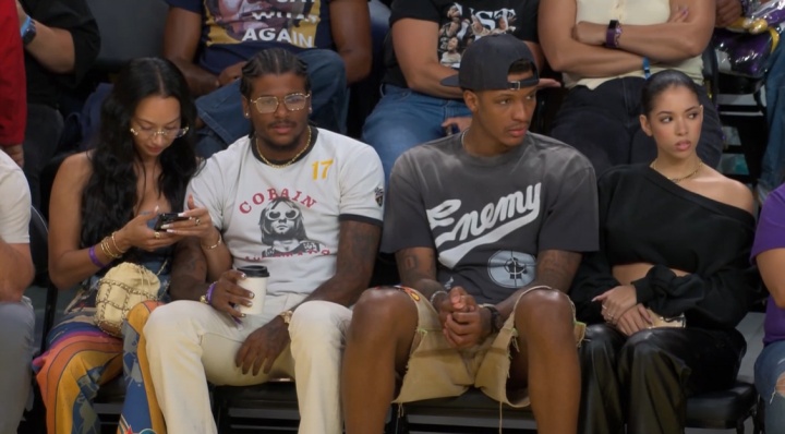 懂球直播08月21日讯 今日进行的WNBA常规赛飞翼VS火花的比赛。 场边,太阳球员杰伦-格林携40岁的女友Draya,与前队友小贾巴里-史密斯及其女友一同场边观战飞翼VS火花的比赛。 更多内容小编懂得。