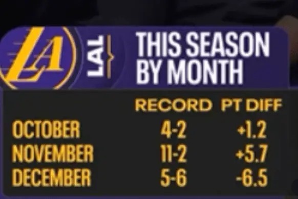 湖人前3个月战绩&净胜分:11月11胜2负 12月5胜6负净胜分-6.5分