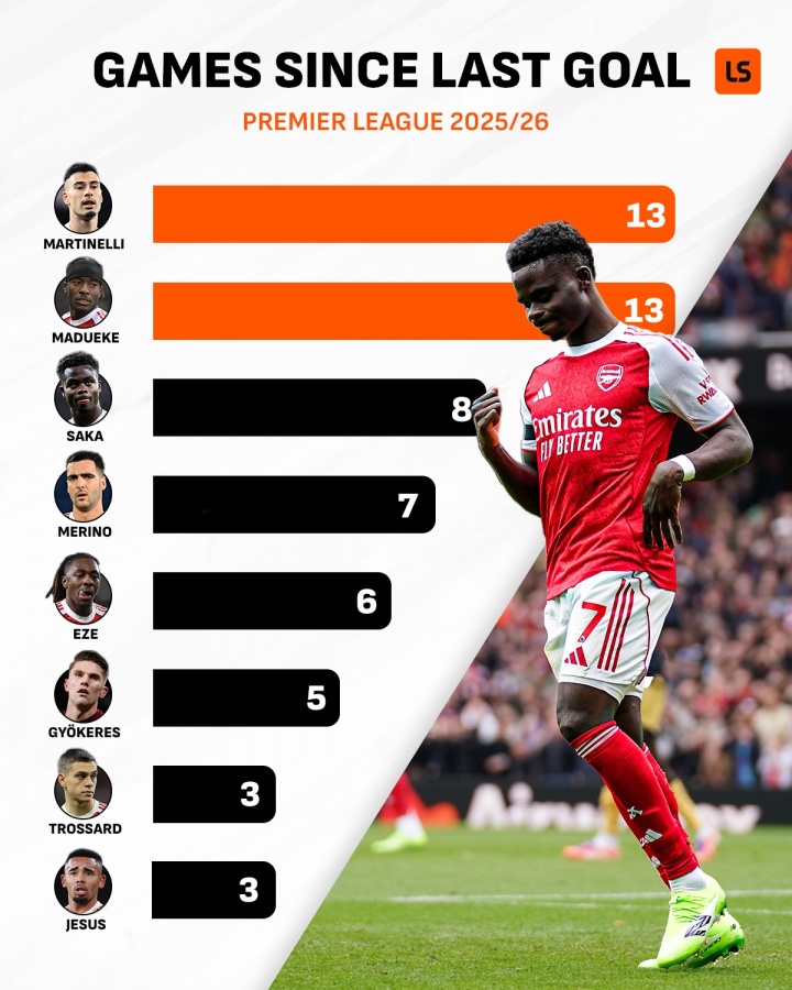 懂球直播01月19日讯 尽管阿森纳目前在英超以7分优势领跑,但根据LiveScore统计,阿森纳队内一众攻击手已经遭遇至少3轮的联赛球荒,多的甚至有13轮。 阿森纳队内前锋联赛球荒: 马丁内利、马杜埃凯:13轮 萨卡:8轮 梅里诺:7轮 埃泽:6轮 约克雷斯:5轮 特罗萨德、热苏斯:3轮