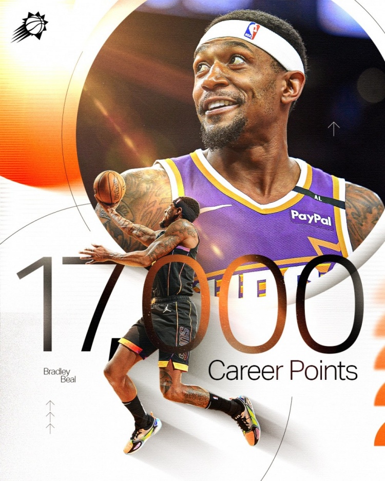懂球直播2月21日讯 NBA常规赛,太阳对阵马刺的比赛正在进行中。 比尔已经得到了4分,这样他的生涯总得分正式越过了17000分大关(本场比赛前16997分)。