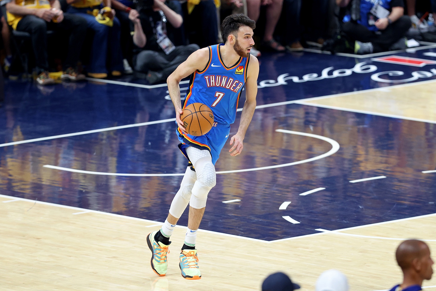 懂球直播6月17日讯 NBA总决赛G5,雷霆120-109战胜步行者。 本场比赛,雷霆内线霍姆格伦表现还可以,虽然进攻手感不佳但防守出色,在34分钟的时间里,投篮15中4,三分球3中1,拿到9分11篮板(5前场篮板)1抢断3盖帽的数据,正负值+12。