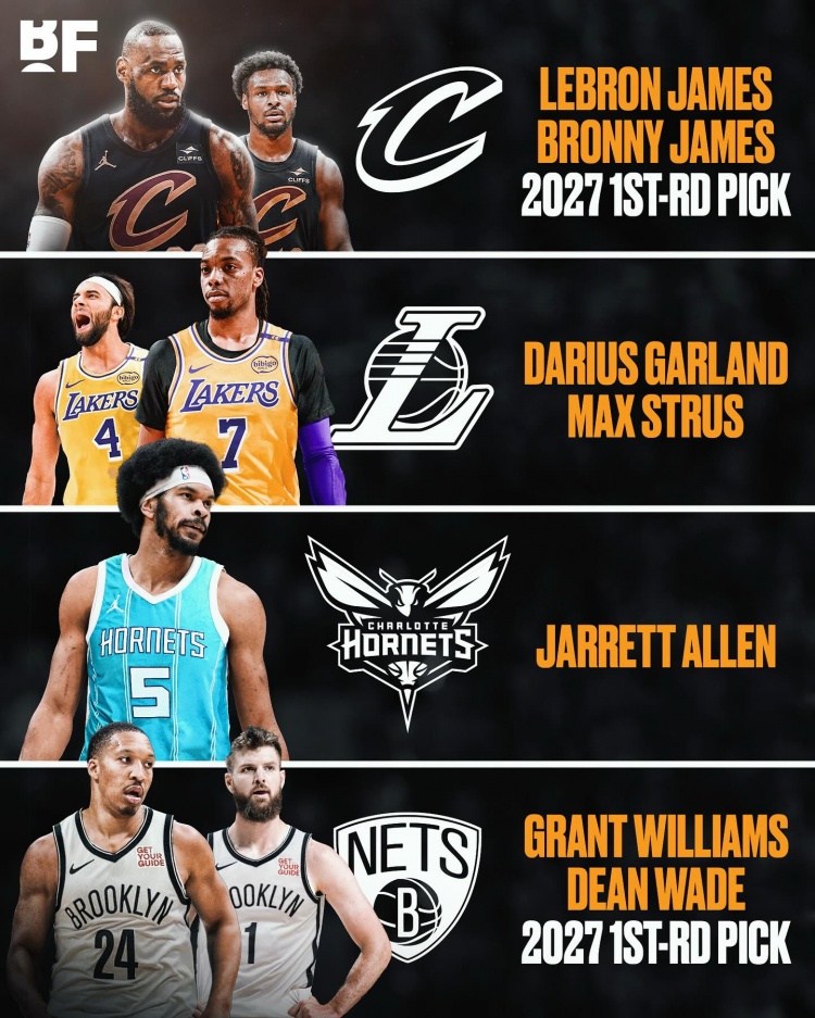 骑士得到:勒布朗-詹姆斯、布朗尼、2027年首轮签; 湖人得到:加兰、斯特鲁斯; 黄蜂得到:贾雷特-阿伦; 篮网得到:格兰特-威廉姆斯、迪恩-韦德、2027年首轮签。