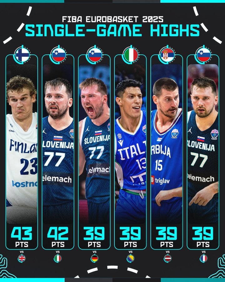 懂球直播9月17日讯 今天,男篮欧锦赛官推晒出了本届赛事的单场得分榜。具体为: 马尔卡宁43分(VS英国) 东契奇42分(VS意大利) 东契奇39分(VS德国) 丰泰基奥39分(VS瑞典) 约基奇39分(VS拉脱维亚) 东契奇39分(VS法国)