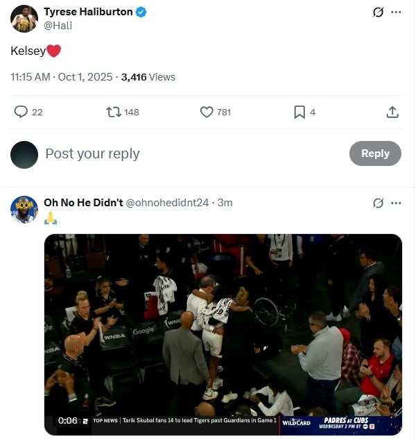 懂球直播10月1日讯 WNBA季后赛半决赛G5,印第安纳狂热对阵拉斯维加斯王牌。 比赛中狂热球星凯尔希-米切尔受伤被搀扶离场,本场不会回归。 印第安纳步行者核心哈利伯顿发推祝福:“凯尔希❤️” 上赛季总决赛G7,哈利伯顿就遭遇了跟腱断裂的重伤,步行者也最终3-4功亏一篑,无缘总冠军。